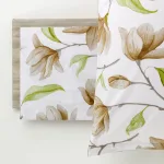 Il completo lenzuola florea di Enrico Coveri è in 100% cotone percalle che è un tessuto composto da filati fini a struttura fitta che si ottiene lavorando il cotone ad armatura tela con una perfetta perpendicolarità tra trama e ordito.